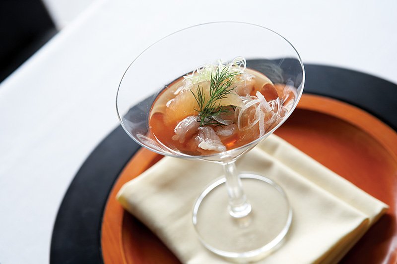 “발렌타인 데이에 선보인 스페셜 메뉴를 구상하다 개발하게 된 새로운 메뉴입니다. 봄에 한창 살이 올라 싱싱한 도미를 프레시하게 즐길 수 없을까 고민하다 우리나라의 물회를 떠올렸죠. 이탈리아식 카르파치오는 흔히 만들어 먹지만 이렇게 드레싱에 흠뻑 담가 먹는 카르파치오는 흔치 않잖아요. 싱싱한 도미살과 석류 주스만 있으면 누구나 쉽게 만들 수 있습니다. 특히 그레이프 프루트와 함께 도미살을 먹으면 그 맛이 일품입니다. 이렇게 마티니 글라스에 1인분씩 담아내면 훌륭한 애피타이저가 될 뿐 아니라 케이터링 메뉴로도 손색이 없겠죠?” – 셰프 L