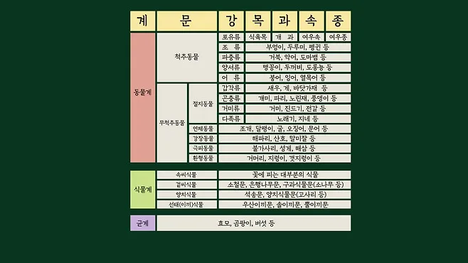 먼저 많이 봤을 생물종의 분류부터 보면 아래와 같습니다. 종들이 모여 속을 이루고, 속들이 모여 과를, 과들이 모여 목을, 이렇게 상위 단계로 확장되는 분류 체계인데, 우리 인간과 가까운 포유류는 포유강에 속합니다.