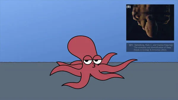 또 다른 대표적인 무척추동물(연체동물)에 두족류인 문어가 있습니다. 문어는 높은 지능을 지닌 것으로 알려진 비인간 동물인데, 활동 수면과 비활동 수면의 구분이 발견됐습니다.