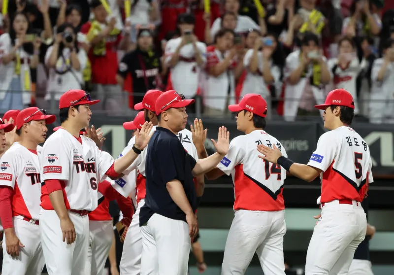 (광주=연합뉴스) 조남수 기자 = 28일 광주기아챔피언스필드에서 열린 프로야구 SSG 랜더스와 KIA 타이거즈의 경기. KIA 이범호 감독과 코치진이 7-6으로 승리한 선수들과 하이파이브 하고 있다. <무단 전재 재배포 금지, AI 학습 및 활용 금지>