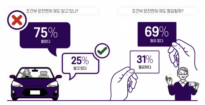 그러나 조건부 운전면허 제도에 대한 사회적인 인식은 아직 낮은 상황이다. 본지에서 전국 만 60~74세 남녀 300명을 대상으로 설문조사를 실시한 결과, 조건부 운전면허 제도에 대해 ‘몰랐다’는 응답이 75%에 달했다. 25%만이 조건부 운전면허 제도를 알고 있다고 답했는데, 필요성을 묻는 질문에는 69%가 ‘필요 없다’는 반응을 보였다.