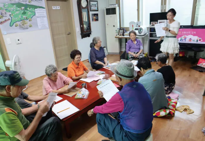 교통사고를 예방하기 위해서는 운전자와 보행자 모두 안전교육이 필요하다고 느낀 교안문협회는 경로당, 마을회관을 찾아다니며 교통안전교육을 실시한다. 지난 8월, 구자애 교안문협회 사무국장이 교육을 진행하는 현장에 동행했다. 처음으로 찾은 곳은 홍성군 홍성읍 소향2리 마을회관이었다. 구자애 사무국장은 교통안전송을 통해 교육을 재밌게 진행했고, 10명의 주민은 뜨거운 반응을 보였다.