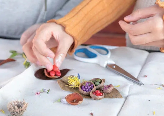 ② 열매를 담을 그릇과 숟가락 젓가락이 될 자연물을 찾아요.