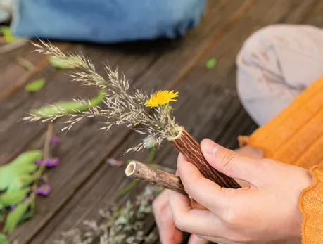 ③ 선생님이 미리 준비해 둔 속이 빈 갈대 줄기에 예쁘게 꽂아 꽃다발을 만들어봐요.