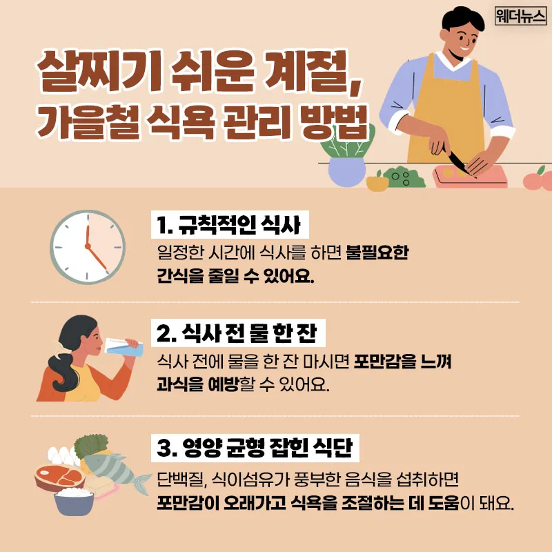 하지만 과도한 식욕은 건강한 체중 유지에 방해가 될 수 있으니, 오늘은 가을철에도 슬기롭게 식욕을 관리할 수 있는 몇 가지 간단한 방법을 살펴볼까요?