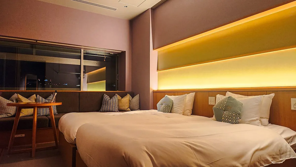 객실로도 그 규모는 이어진다. 가로로 긴 형태가 강조되는 창문과 인테리어로 이루어져 더 널찍해 보인다. 밤에 창밖으로 보이는 야경은 꼭 기다란 두루마리 위 그림을 보는 듯하다. 침대는 연두부같이 보드라움이 강조된 폭신함이다. 특히 트윈룸은 바닥이 다다미로 이루어져 있는데 맨발에 닿는 다다미의 촉감이 매끄러우면서도 편안한 느낌을 준다.