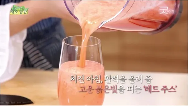 출처 : 유튜브 ‘굿라이프’ 첫 번째 추천 조합은 사과와 파프리카, 토마토다. 이는 채소 소믈리에 홍성란이 제안하는 과채주스 레시피다. 몸이 붓고, 무거운 아침, 활력을 올려줄 수 있는 주스로 붉은 빛의 과일주스가 보기에도 맛있어 보이는 것이 특징이다. 건강에도 좋고 붓기 제거에도 효과적인 조합. 흔히 접할 수 있는 재료인 만큼 당장 시작해도 좋겠다.