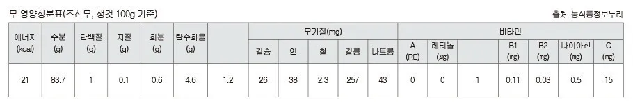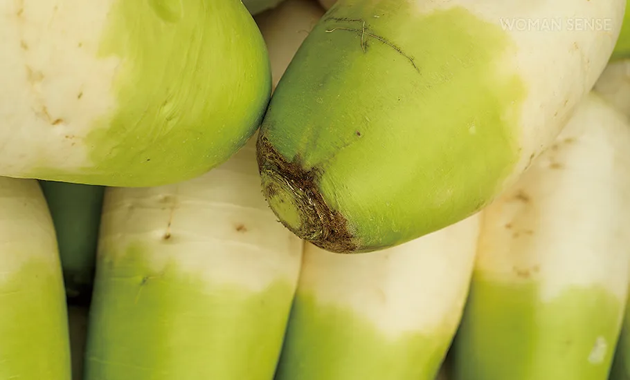 예뻐지기 위해서라도 겨울 무는 꼭 먹어야 한다. 100g당 21kcal로 열량이 낮고 식이섬유가 풍부해 다이어트식으로도 무만 한 게 없다. 중국의 약학서 <본초강목>에는 “무는 몸을 가볍게 하면서 살결을 곱게 만들어준다”고 기록돼 있다. 무에는 비타민 C가 풍부해 색소침착을 줄여준다. 또한 무는 담배 속 니코틴을 중화하고 해독해 소변으로 배출시키는 효과를 지니고 있다. 숙취를 일으키는 아세트알데히드 성분을 몸 밖으로 배출시키고, 알코올 분해 효과가 있는 베타인 성분까지 풍부해 최고의 해장 음식이다. 해장국을 끓일 때 무 채수를 사용하면 금상첨화다.