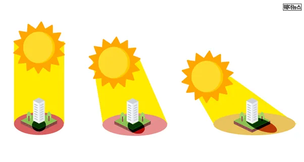 또한, 앞서 언급한 듯이 햇빛이 대기를 비스듬히 통과하는 겨울에는 그림자가 길지만, 이와 반대인 여름에는 그림자가 짧은 것을 볼 수 있습니다.
