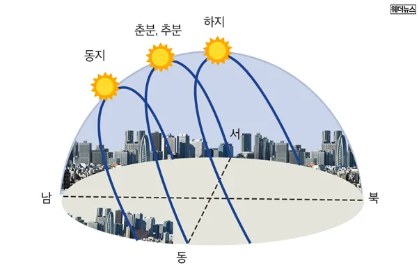 가장 큰 차이를 보이는 절기인 ‘동지’와 ‘하지’에는 태양의 위치가 일년 중 가장 ‘낮고’’높기’ 때문에 밤과 낮의 길이가 달라지는 것입니다.