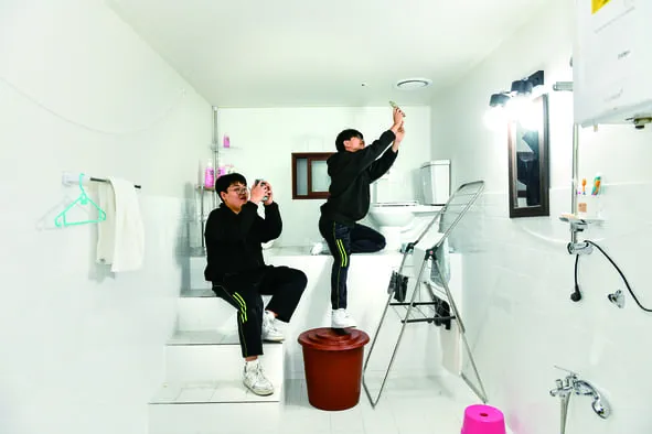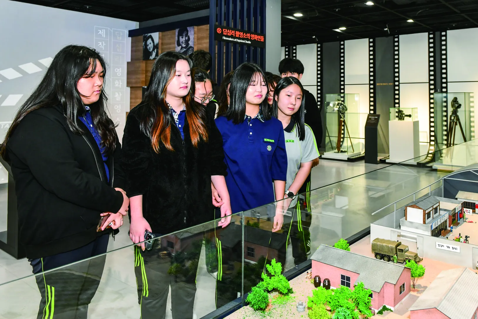 도슨트의 안내를 따라 학생들이 삼삼오오 무리를 지어 센터 투어를 시작했다. 전시관을 돌며 오래된 촬영기기와 디오라마*를 살피는 사이 “오~”, “아~” 하는 감탄사가 간간이 들렸다. 차분하게 안내를 따르며 집중하는 모습에 ‘조용하고 내향적인 친구들이 많은 편’이라는 박 교사의 소개말을 체감하나 싶었는데, 짧은 투어가 끝나고 간단한 영화 세트장이 꾸며진 2층에 도착하자 학생들의 표정이 사뭇 달라졌다. 그저 낯을 좀 가렸던 것일까? “자유 관람을 해도 좋다”는 박 교사의 말이 떨어지자마자 학생들은 스마트폰을 꺼내 셀카를 찍거나 조성된 세트 안으로 들어가 서로의 모습을 담았다.