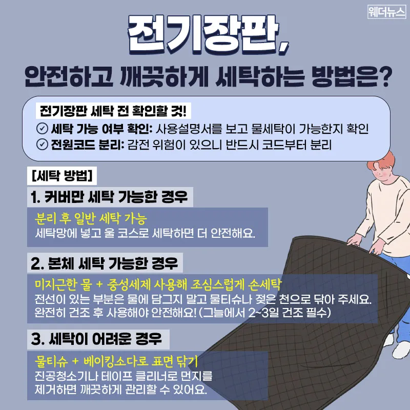 겨울철 필수 아이템인 전기장판, 잘못 세탁하면 고장이나 감전 위험이 있을 수 있어 주의가 필요합니다.