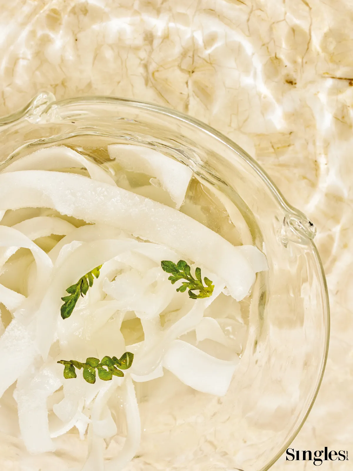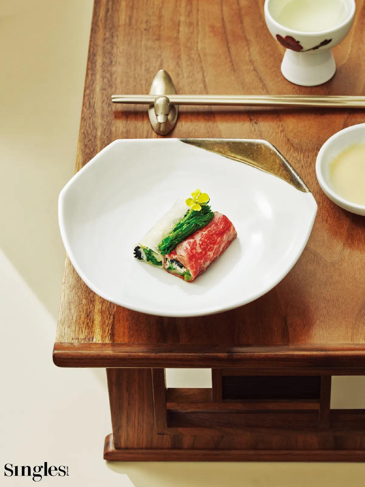 오랜 시간 한식 파인다이닝의 중추 역할을 해온 ‘권숙수’의 권우중 셰프는 이번 봄 메뉴로 ‘두릅전병’을 선보였다. 두릅이라는 재료를 잘 살리면서 두릅을 사용하는 한식 요리의 지평을 넓히고 싶어서다. 두릅은 향으로 음미한다. 두릅의 향을 최대한 해치지 않기 위해 아주 얇게 저민 암소 한우 채끝과 산도라지를 갈아 넣은 전병으로 겉을 감쌌다. 입에 넣는 순간 얇은 전병은 혀끝에서 맥없이 풀어지고 곧장 대게의 결과 까치버섯의 흙내음, 두릅의 단단함과 온유함이 존재감을 드러낸다. 전병에 들어간 산도라지와 속재료인 까치버섯 모두 산에서 자라는 야생 재료로 참두릅과 어우러지며 두릅 고유의 향을 증폭시켜준다. 함께 곁들이는 두부겨자장은 고소한 전병의 맛에 한 올의 깃을 세운다.