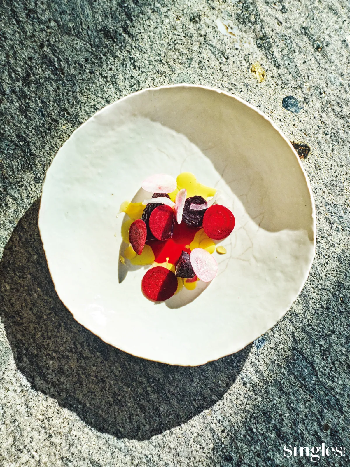 1스타를 거머쥔 것과 더불어 그린스타에 이름을 올린 ‘기가스’. 어릴 적부터 시골농장에서 나고 자란 정하완 셰프에게 팜투테이블은 콘셉트가 아닌 그저 자연스러운 이치다. 그가 선보인 비트는 겨울이 오기 전 항아리에 넣어 땅속에 묻어놨다 늦겨울과 이른 봄에 선보이는 요리. 이름도 비트를 묻은 날인 ‘11월 30일’이다. 늦가을이 느껴지는 이름이지만 2~3개월 차가운 땅속에서 봄을 기다려야 마침내 완연해진다. 땅속에 저장한 비트는 수분이 빠지고 단맛이 응축돼 최소한의 소금과 올리브유, 비트주스와 식초, 끓인 레몬으로만 간한다. 최대한 덜어내는 그의 조리법은 비운다는 원칙이 아닌 그 자체로 충분한 원물의 기질에 근원한다. 불스 블러드 비트는 새끼손가락 두께로 썰어 구워 쫄깃하고 화이트 비트와 레드 비트는 생으로 얇게 썰어낸다. 단단한 땅과 온화한 흙, 사려 깊은 인내의 시간이 깃든 맛. 봄의 문턱, 기가스의 코스를 여는 첫 맛이다.