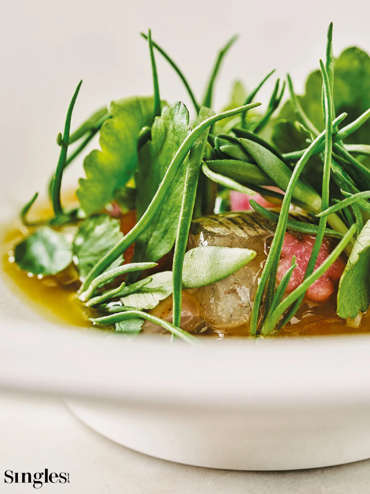 임프레션으로 강한 인상을 남기고 ‘레스토랑 알렌’으로 미쉐린 2스타를 유지하고 있는 서현민 셰프는 세 가지 봄나물이 올라간 해산물 전채를 소개했다. 불똥오징어는 간장에, 학꽁치 살은 다시마에 감싸 절였고, 북방조개는 액젓과 올리브유로 살짝 구웠다. 다시마와 가다랑어포 같은 해산물 베이스로 뽑은 육수에 제주 한라봉 주스와 캐모마일을 우려내 차갑게 식힌 소스를 곁들이고 봄의 돌나물, 미나리, 세발나물을 올린다. 한입 먹으면 폭발적인 감칠맛 뒤로 아삭아삭한 돌나물과 세발나물의 치밀한 식감이 느껴지고, 미나리의 향긋함이 여운을 남긴다. 끈적한 마와 콜라비 피클 조각도 제 역할을 한다. 바다의 감칠맛과 산뜻한 봄 채소의 어울림. 한입의 봄이다.