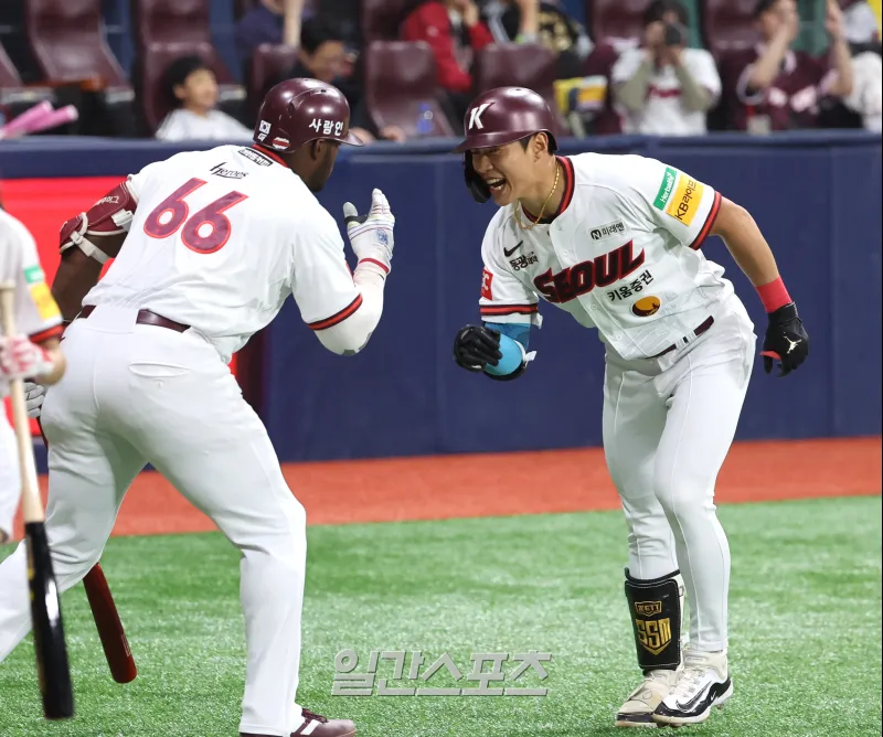 2025 KB0리그 프로야구 키움히어로즈와 LG트윈스의 경기가 9일 오후 서울 고척스카이돔에서 열렸다. 1회말 무사 송성문이 선두타자 홈런를 치고 홈인해 푸이그와 세리머니를 하고 있다. 고척=김민규 기자 mgkim1@edaily.co.kr /2025.04.09/