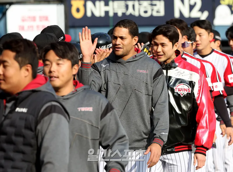 2025 KB0리그 프로야구 LG트윈스와 KIA타이거즈의 경기가 6일 오후 서울 잠실야구장에서 열렸다. 5대 1로 승리한 LG 선발 치리노스 등 선수들이 경기 종료 후 자축하고 있다. 잠실=김민규 기자 mgkim1@edaily.co.kr /2025.04.06/
