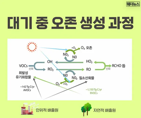 지표면의 오존은 대기 중 질소산화물(NOx)과 휘발성 유기화합물(VOCs)이 강한 햇빛의 자외선과 만나 광화학 반응을 일으켜 생성되는 2차 오염물질입니다.