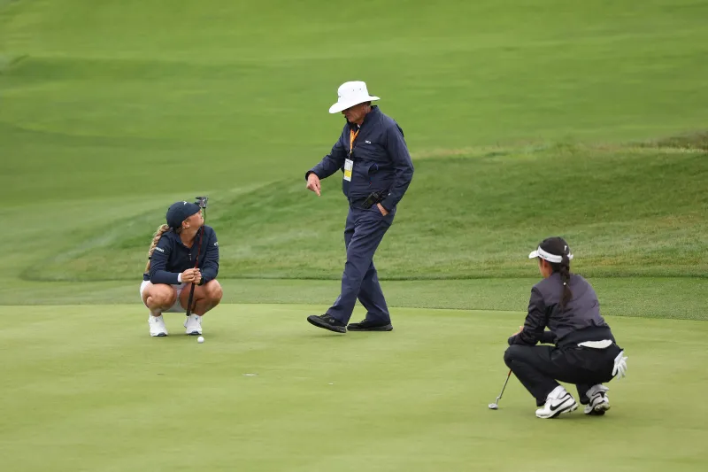 PEBBLE BEACH, CALIFORNIA - JULY 07: Bailey Tardy of the United States talks with a rules official on the eighth green during the second round of the 78th U.S. Women's Open at Pebble Beach Golf Links on July 07, 2023 in Pebble Beach, California. Ezra Shaw/Getty Images/AFP (Photo by EZRA SHAW / GETTY IMAGES NORTH AMERICA / Getty Images via AFP)/2023-07-08 01:55:47/ <저작권자 ⓒ 1980-2023 ㈜연합뉴스. 무단 전재 재배포 금지.>