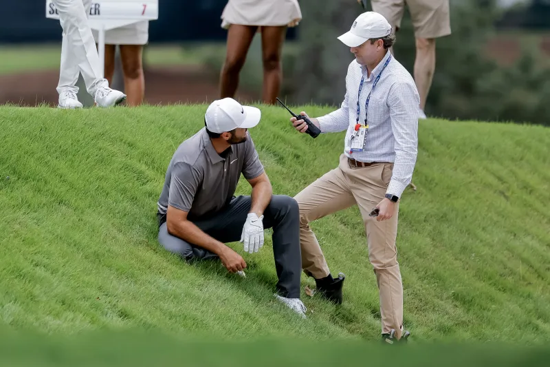 epa12317316 Scottie Scheffler (L) of the US speaks to a rules official about the position of his ball in side of a fairway bunker on the 17th hole during the second round of the 2025 Tour Championship golf tournament at the East Lake Golf Club in Atlanta, Georgia, USA, 22 August 2025. The tournament is the finale of the PGA Tour's FedExCup playoffs. EPA/ERIK S. LESSER/2025-08-23 06:40:19/ <저작권자 ⓒ 1980-2025 ㈜연합뉴스. 무단 전재 재배포 금지, AI 학습 및 활용 금지>
