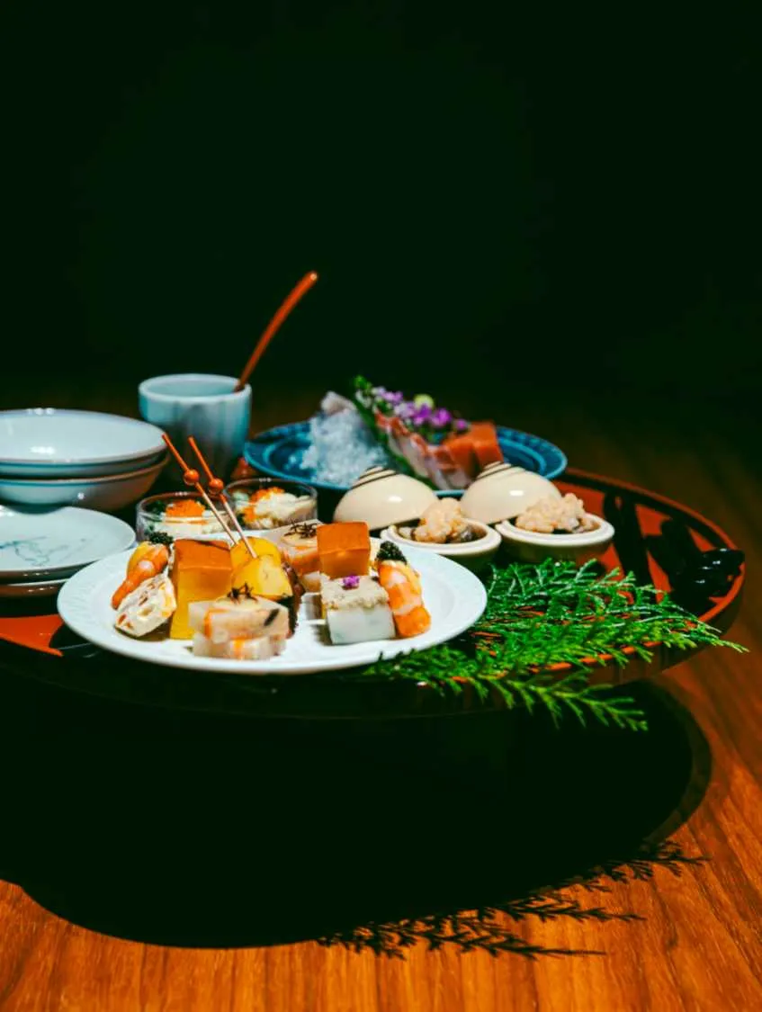 저녁이 오면 가이세키를 즐길 차례. 완전 별도의 공간은 아니지만, 다른 투숙객들과 눈 마주칠 일 없이 우리끼리 오붓하게 식사할 수 있다. 저녁은 6가지 요리로 구성된 가이세키로, 나가사키와 운젠의 식문화를 고스란히 담았다. 연회 요리 싯포쿠를 재해석한 ‘호라쿠모리(宝楽盛り)’, 나가사키의 명물인 아고다시(날치 육수)를 활용한 나베(전골) 요리가 시그니처다.