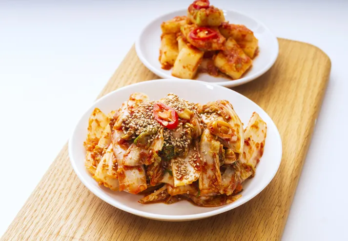 우리나라를 대표하는 김장김치로, 절인 배추에 고춧가루·젓갈·마늘 등을 넣어 버무립니다.