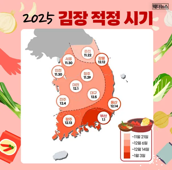100년 전만 해도 중부지방의 경우 김장 적정 시기가 11월 중순이었지만, 최근에는 11월 말~ 12월 초가 김장하기에 적정한 시기로 분석됩니다.