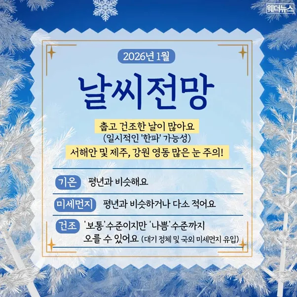1월에는 대체로 맑은 날들이 이어지면서 대기의 건조함이 심화될 것으로 보입니다.