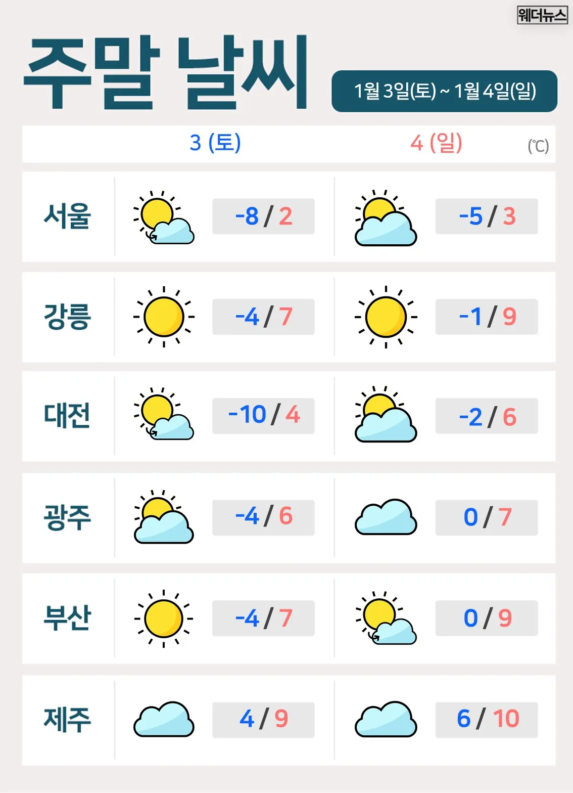 매서운 추위가 녹아내리는 이번 주말, 2026년을 활기차게 시작하시길 바라며 웨더뉴스와 함께 따뜻하고 행복한 주말 보내시길 바랍니다.