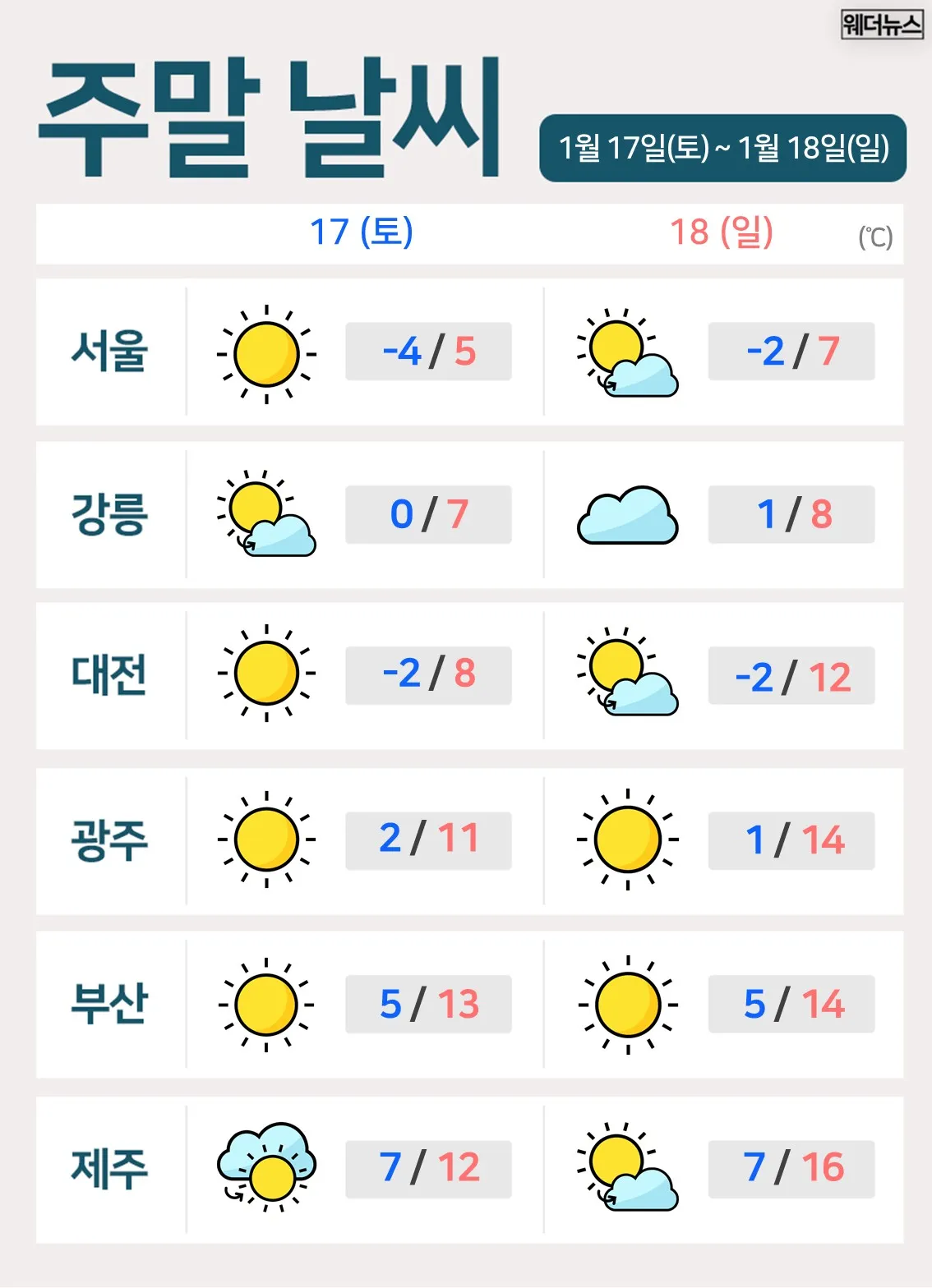 한겨울 추위가 잠시 숨을 고르는 이번 주말, 웨더뉴스와 함께 따뜻하고 행복한 주말 보내시길 바랍니다.