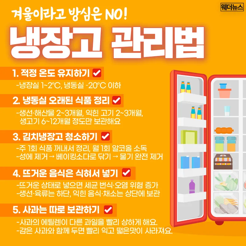 날씨가 춥다고 해서 음식이 잘 상할 리 없다고 생각해 냉장고 관리를 소홀히 했다가는, 세균 번식이나 식품 변질로 오히려 건강을 위협할 수 있습니다.