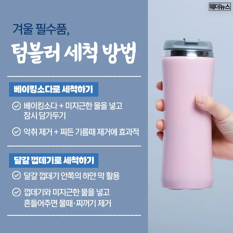 우리가 매일 사용하는 텀블러, 깨끗하게 관리해서 오래 쓰는 것만으로도 환경을 지키는 큰 걸음이 됩니다. 올겨울엔 따뜻한 텀블러와 함께 지구를 위한 온기를 나눠보세요.