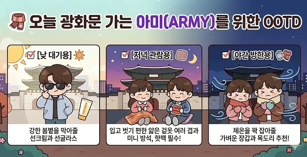 역대급 무대가 펼쳐질 오늘, 광화문으로 향하시는 분들은 든든한 옷차림과 여유 있는 이동 계획으로 안전하고 뜨거운 '봄날'을 만끽하시길 바랍니다!
