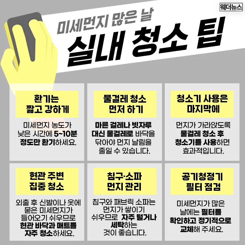 오늘은 미세먼지 심한 날, 집 안의 먼지를 확실하게 잡고 쾌적한 실내를 유지하는 똑똑한 청소 팁 6가지를 소개합니다.