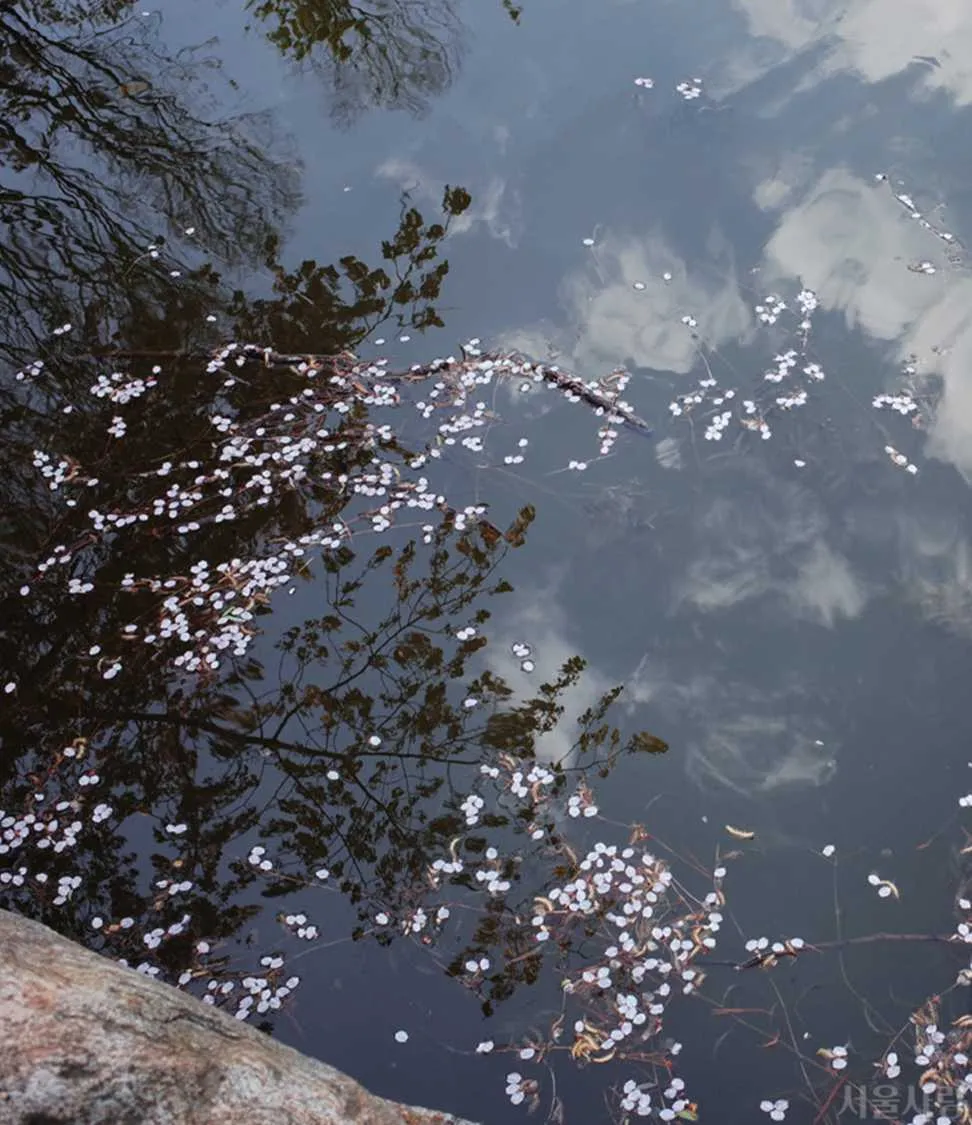 창경궁 춘당지 위로 살며시 흘러가는 벚꽃잎들, 바람과 물결에 몸을 맡긴 채 봄의 끝자락을 천천히 그려낸다. 잠시 머물다 사라지기에 더욱 애틋한 순간이다.