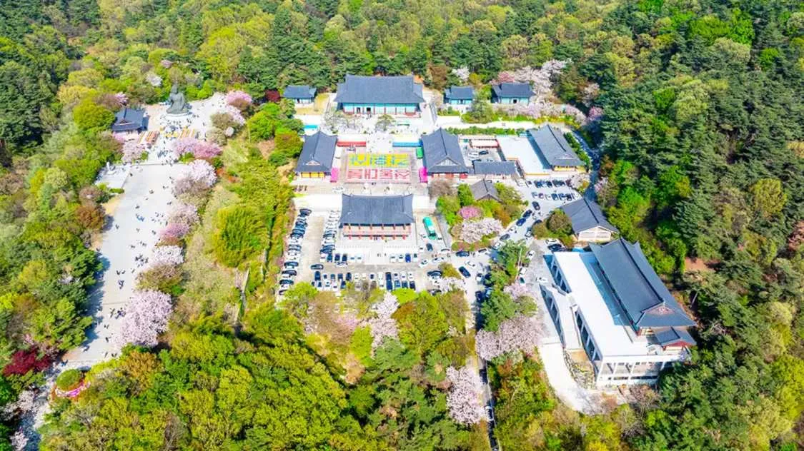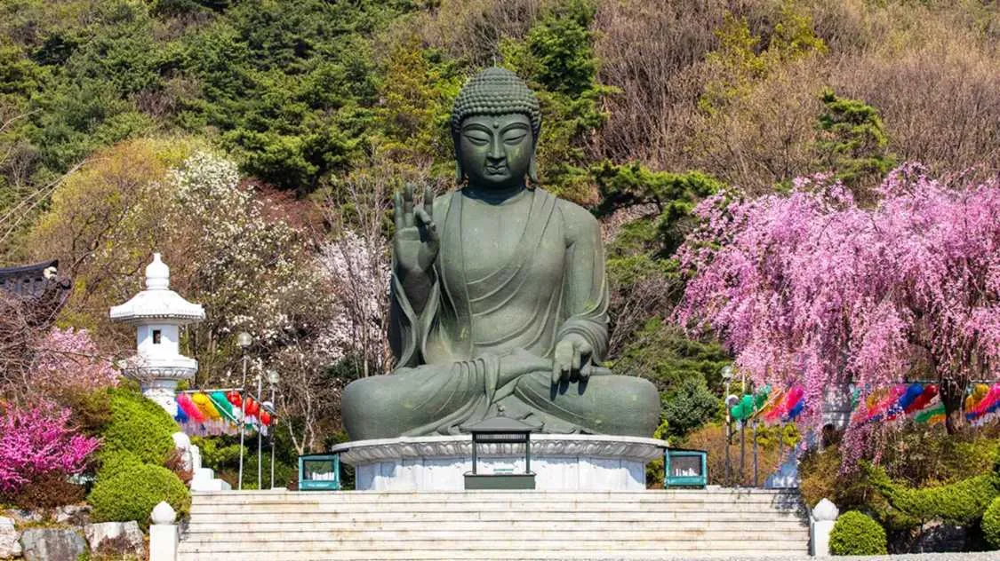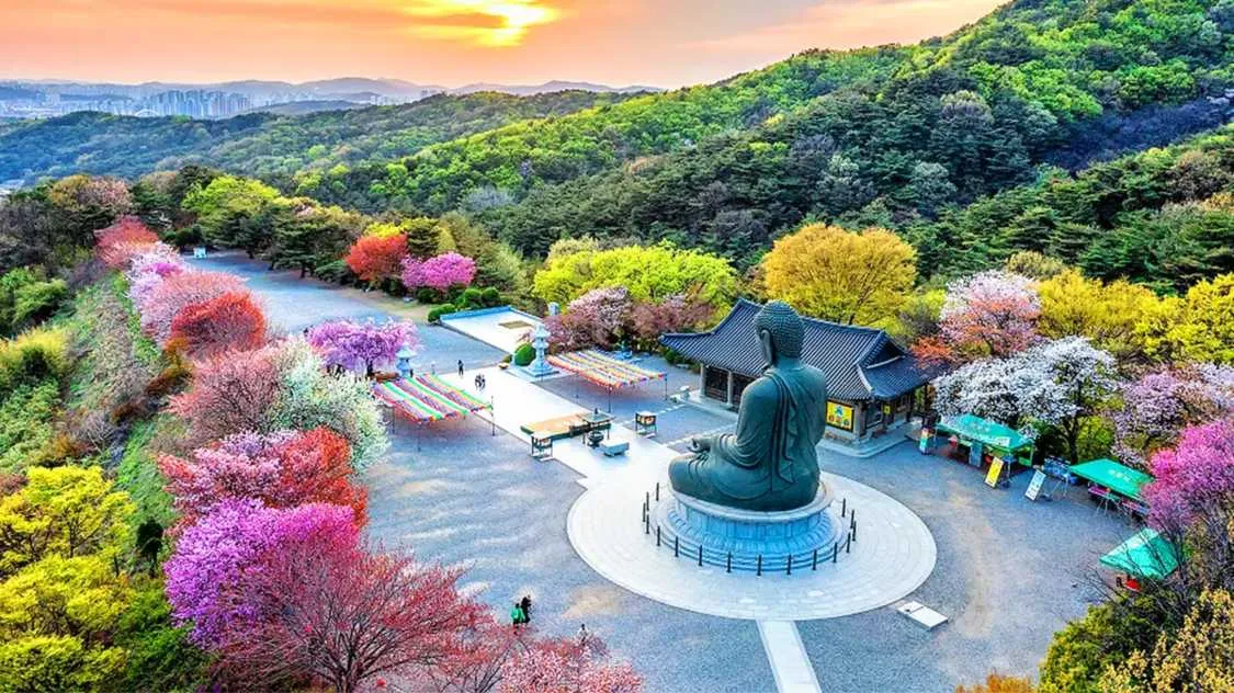 이 공간에는 봄꽃보다 먼저 시선을 압도하는 존재가 있다. 높이 15m, 무게 60톤의 청동대불이 태조산 중봉 위에서 서향으로 자리를 지키고 있으며, 1977년 봉안 이래 반세기 가까이 그 자리를 지켜온 상징이다. 남북통일을 기원하는 서원을 담아 세워진 아미타불 좌불상으로, 불교적 장엄함과 역사적 의미를 동시에 품고 있다.