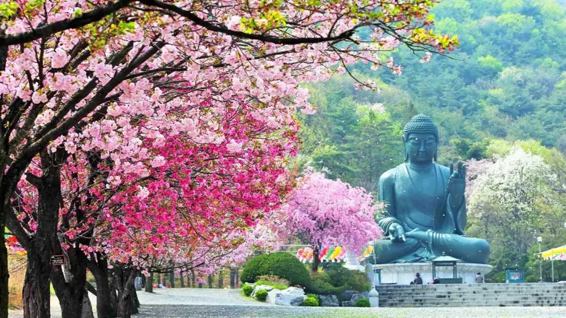 겹벚꽃 절정이 4월 중순에서 20일 전후로 이어지는 이 시기, 청동대불 아래 꽃비가 내리는 풍경은 천안을 대표하는 봄 장면 중 하나로 꼽힌다.