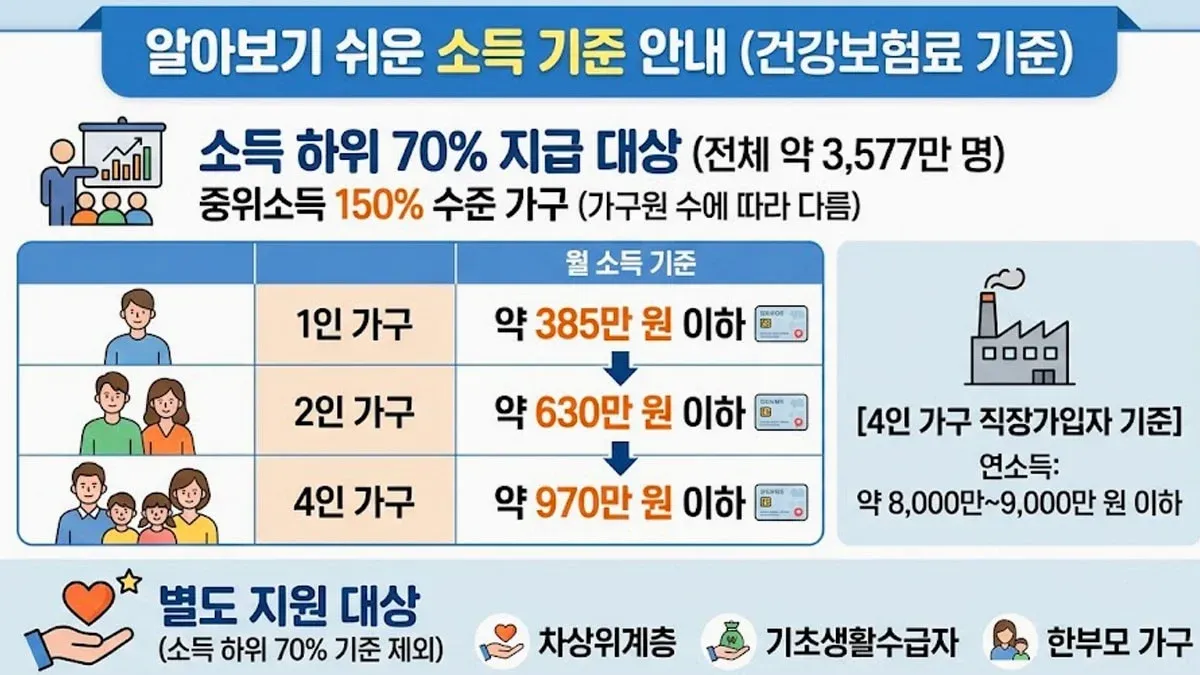 한편 차상위계층과 기초생활수급자, 한부모 가구는 소득 하위 70% 기준과 별도로 지원 대상에 포함된다. 이에 따라 전체 지급 대상은 약 3,577만 명에 이를 것으로 예상된다.