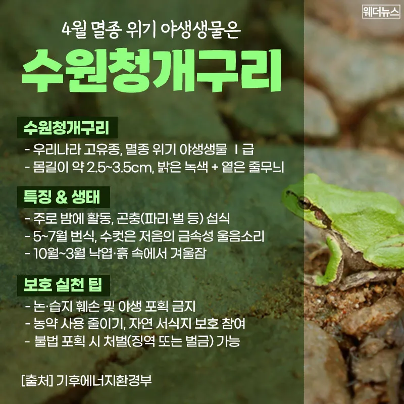기후에너지환경부는 국내 서식 양서류 중 최초로 멸종위기 야생생물 I급으로 지정된 ‘수원청개구리’를 4월의 멸종위기 야생생물로 선정했습니다. 논의 생태계를 상징하는 작고 소중한 생명, 수원청개구리에 대해 자세히 알아볼까요?