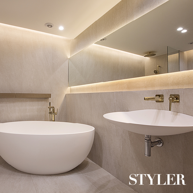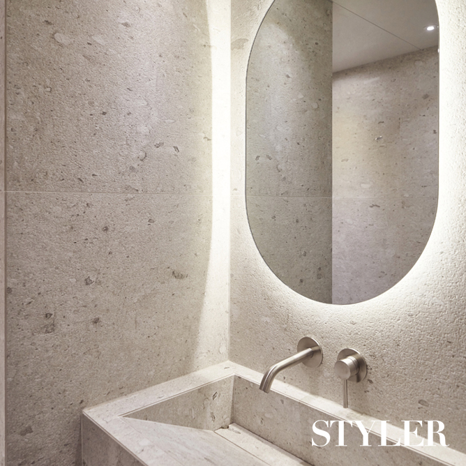 욕조도 오브제처럼 원래 투박한 욕조만 덩그러니 있던 안쪽 공간을 확장해 오브제처럼 멋스러운 둥근 형태의 욕조를 시공했다. 클라이언트가 원한 건 샤워를 겸용할 수 있는 스탠딩 욕조. 작고 각진 구조의 욕실에 한 면 가득 욕조를 설치하면 다소 답답한 느낌을 줄 수 있어 모서리 부분에 사선으로 배치했다. 샤워 부스를 설치하지 않는 대신 개방감을 높이고 공간의 유려한 분위기를 살리기 위해 세면대도 유선형 디자인의 제품을 선택했다. 벽면은 욕조, 세면대와 마찬가지로 고급스러운 무드의 타일로 마감했고, 전면의 선반은 튀지 않는 무광 골드 컬러를 선택했다. 덕분에 곡선과 골드 같은 화려한 요소가 가미되었음에도 불구하고 담백하고 우아한 분위기의 욕실이 완성됐다. 디자인 및 시공_ 카민디자인