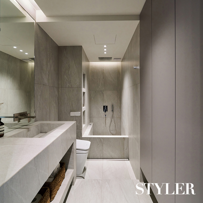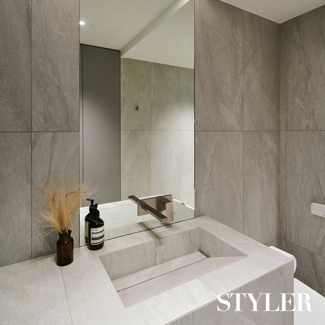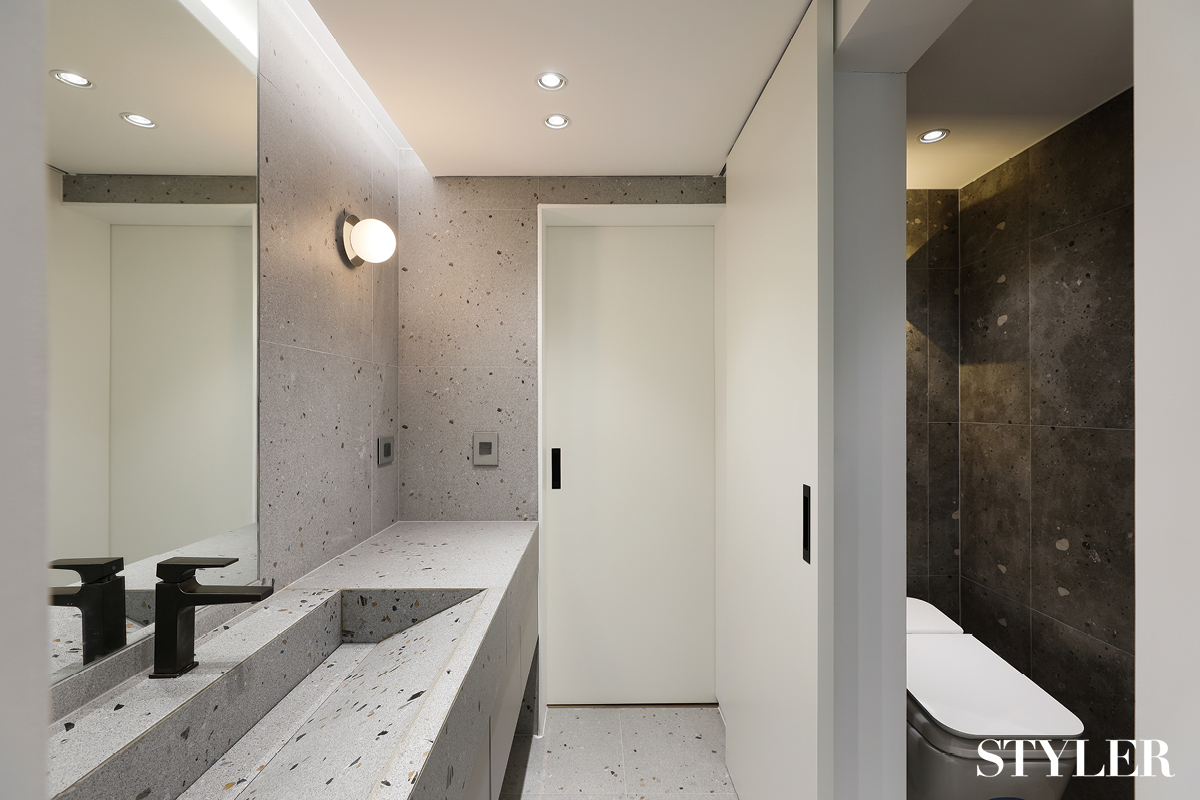 세련된 에지가 돋보이는 공간 안방 옆에 붙어 있는 파우더룸을 미니 욕실로 꾸민 사례. 원목 마루가 깔린 안방과 공간을 구분하기 위해 바닥에 테라조 타일을 시공하고 세면대 상판도 바닥 타일과 같은 소재로 마감했다. 직각 타입의 타일 세면대는 보기에도 깔끔하고, 타일 크기와 동일하게 일대일 사이즈로 맞춰 이물질 끼임 없이 유지와 관리도 용이하다. 디자인 및 시공_이스크 디자인