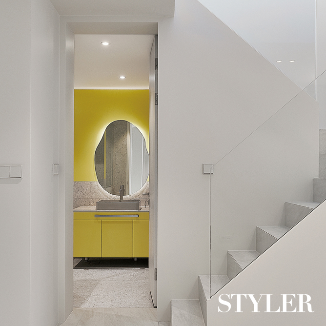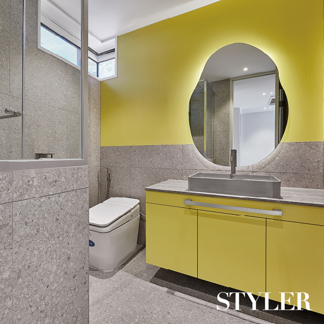 강렬한 색채를 가미한 키즈 배스룸 심플하고 모던하게만 디자인했다면 평범한 서브 욕실에 지나지 않았을 테지만, 발랄한 색을 입혀 아이를 위한 특별한 공간을 하나 더 마련했다. 바닥과 벽은 그레이 톤 테라조 타일로 마감하고, 세면대 하부장과 벽면에 상큼한 레몬 컬러를 가미하니 언제 들러도 기분 좋은 산뜻한 욕실이 탄생했다. 기하학적 형태의 원형 거울까지 안성맞춤으로 어울린다. 화이트로 마감한 집 안 인테리어에 강렬한 포인트가 되어주는 공간이다. 디자인 및 시공_ 더어반인테리어