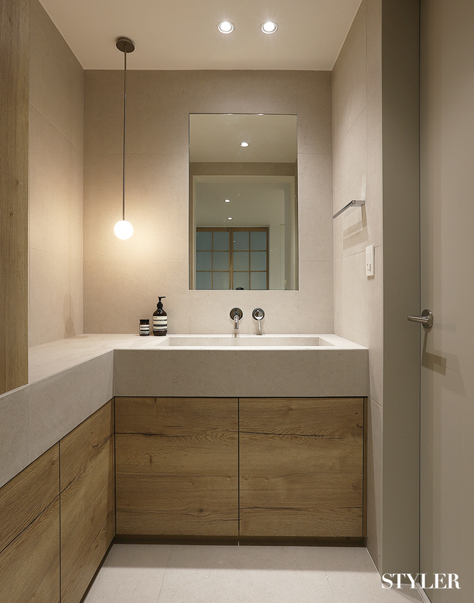 건식으로 사용하는 분리 세면대 샤워 공간, 좌변기 설치 공간, 세면 공간을 분리하면 좀 더 쾌적하게 욕실을 사용할 수 있다. 안방의 격자무늬 중문을 열고 들어가면 나오는 공간으로, 깔끔하게 타일 세면대를 시공했다. 하부장과 상판 한편에 넉넉한 수납장을 짜 넣어 여유롭게 물건을 보관할 수 있고, 미니멀한 펜던트 조명을 달아 포인트를 줬다. 디자인 및 시공_이스크 디자인