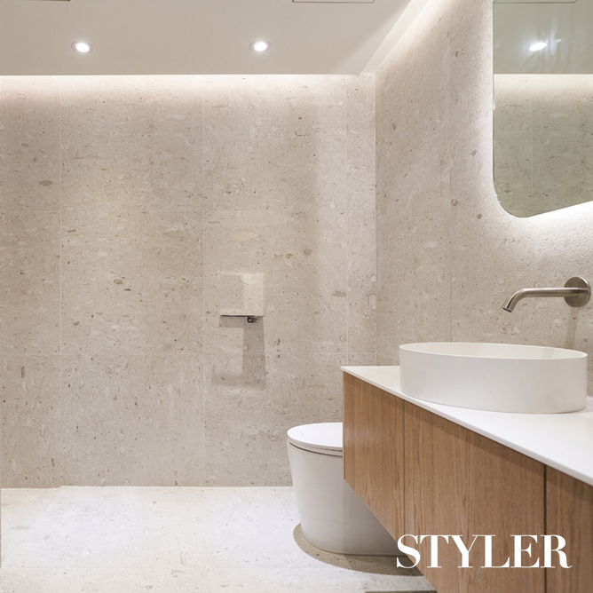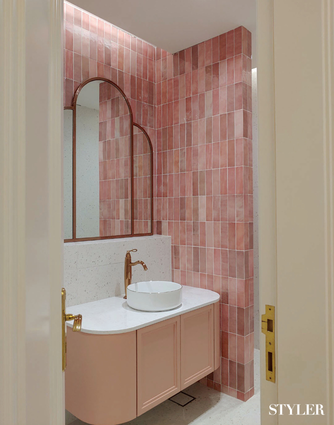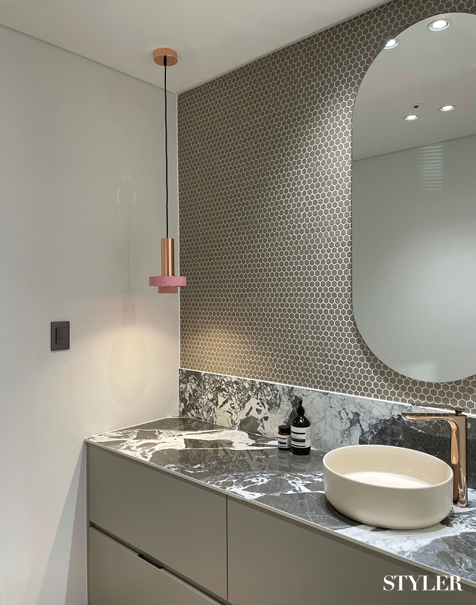 과감한 믹스매치 취향이 묻어나는 욕실을 원한다면 다양한 소재나 패턴, 컬러를 과감하게 믹스해보는 것도 추천한다. 이곳은 욕실 옆에 딸려 있는 작은 파우더룸 공간으로, 하부장 위쪽은 화려한 무늬의 대리석으로, 맞닿은 벽은 아기자기한 패턴 타일로 마무리했다. 툭 떨어지는 핑크색 펜던트 조명은 예상치 못한 컬러 조합을 보여주며 공간에 특별한 느낌을 더한다. 하부장은 심플한 그레이 톤을 배치해 차분하게 마무리했다. 디자인 및 시공_이스크 디자인